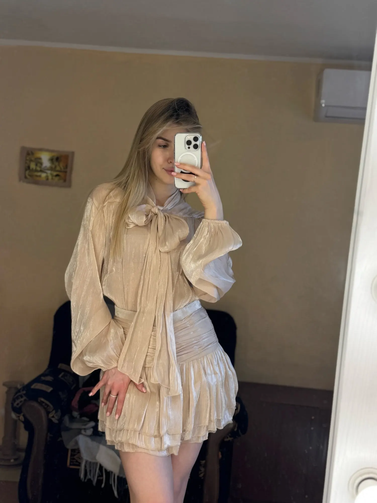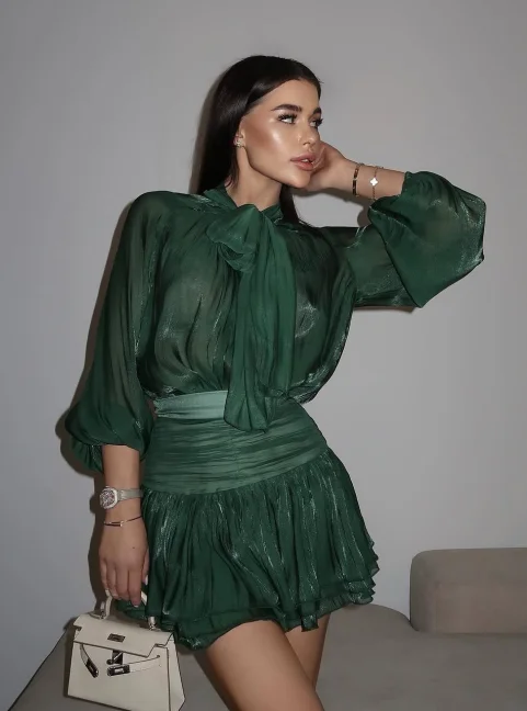 Le haut à nouer apporte une touche romantique et originale, tout en permettant d’ajuster la silhouette à votre convenance. Quant à la jupe courte plissée, elle structure la taille et apporte du mouvement avec une coupe flatteuse et fluide. L'ensemble met en valeur la silhouette tout en gardant un esprit léger et urbain.